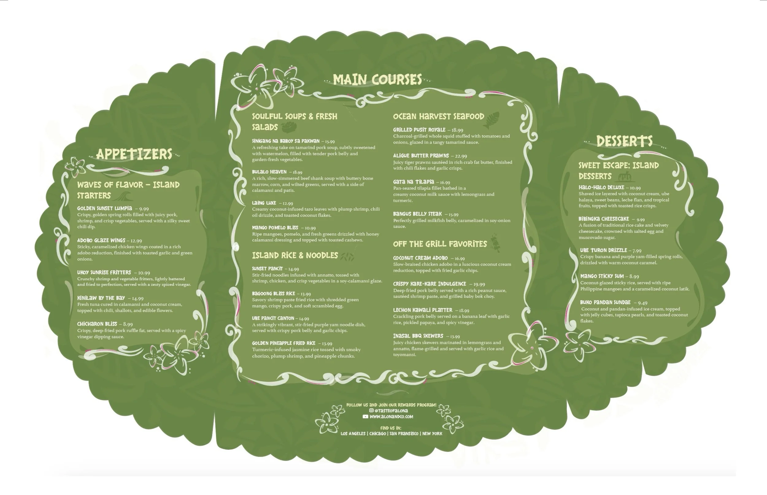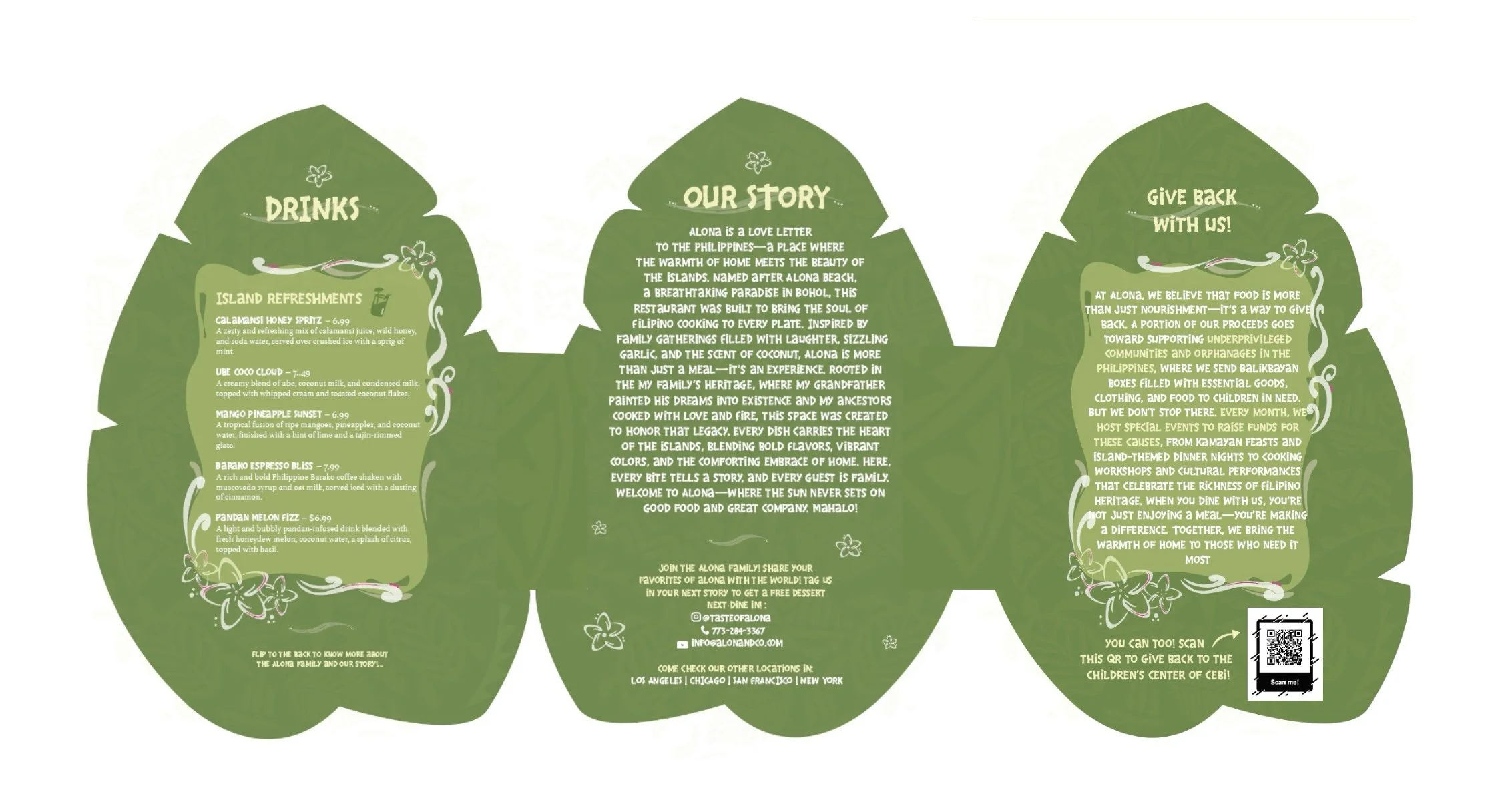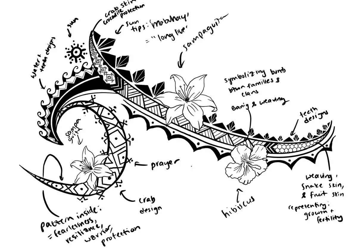 This project celebrates Filipino cultural heritage through the design of a conceptual restaurant menu. Inspired by traditional tribal tattoos, I hand-drew patterns and symbols reflecting the stories and identity within my heritage’s visual language. The faint wavy background pattern references the delicate embroidery of the traditional barong, inspired by a photo of my grandfather wearing one. The menu’s overall shape draws from a banana leaf — a nod to the communal meals my family shares during gatherings. The design weaves research, personal memory, and cultural symbolism into a modern visual expression.